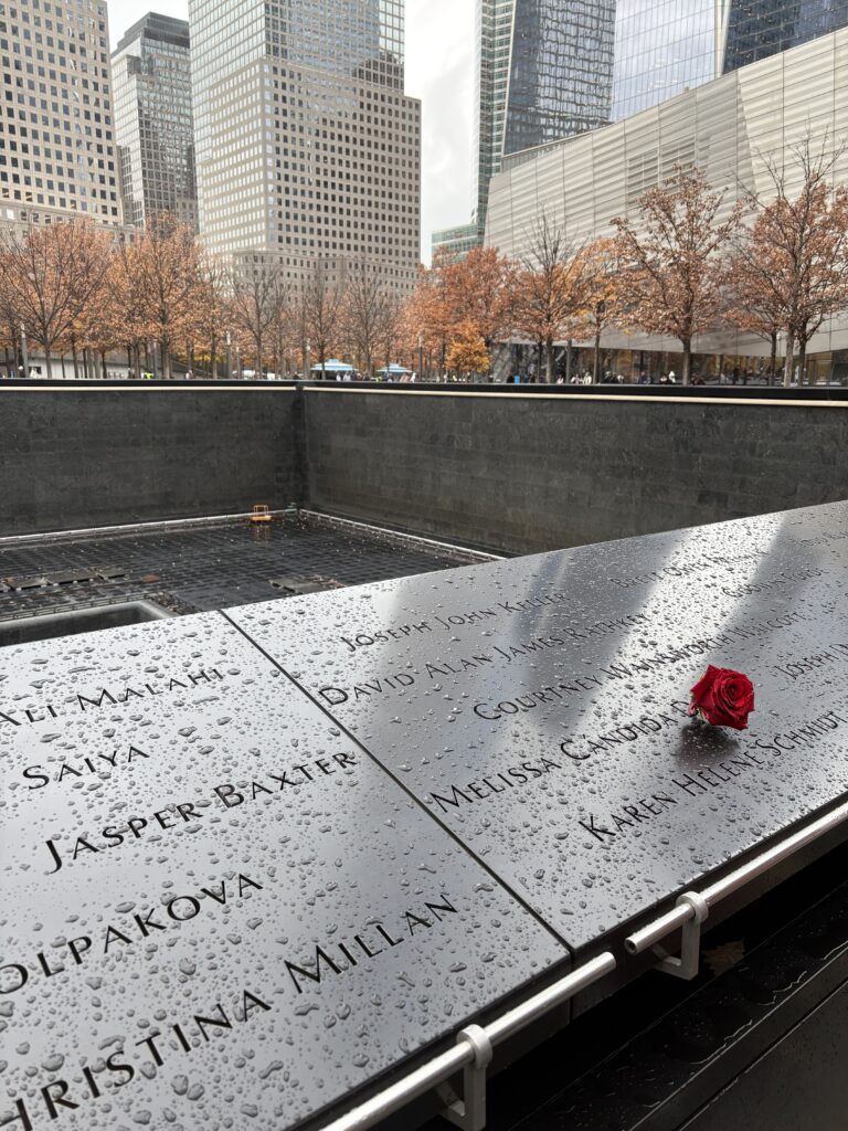 ミュージアムの前には、世界貿易センターの跡地に犠牲者の方々の名前が彫られた慰霊碑があります。所々に薔薇の花が挿してあったのが印象的でした。中央はだいぶ深いプールのような構造になっていました。