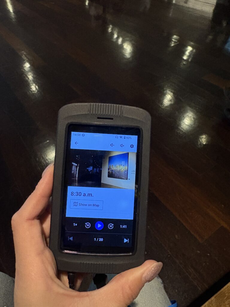 階段を降りていくと、音声ガイドの貸し出しがありました。機械を返却したら無料みたいなことが書いてあったので、なら借りようと思って列に並んでみたら、自分の番になって、デポジットですか?ときいたらどうやら有料のようでした。(大人1人あたり$11、約1700円)