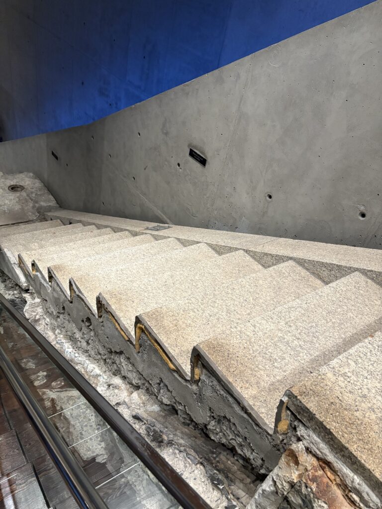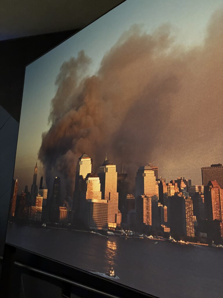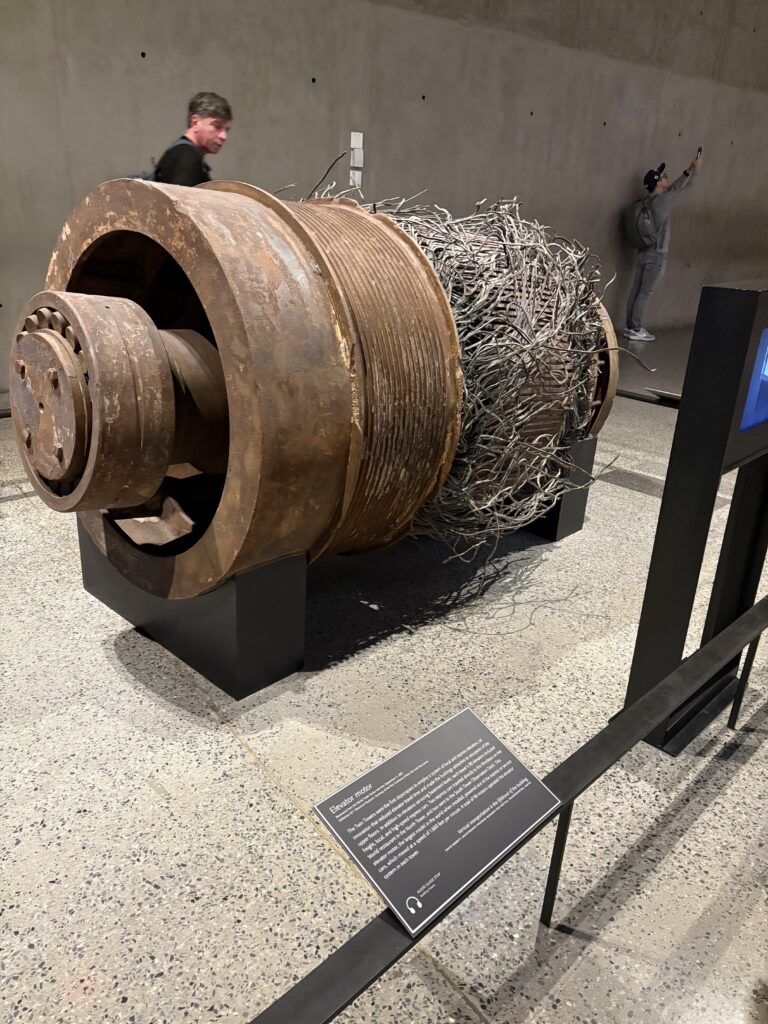 衝撃で歪んでしまったタワー鉄骨や、ひしゃげてしまった消防車、倒壊したタワーから降ってきたと思われるオフィスの燃え残った書類、避難した人々が身につけていた靴や衣類、行方不明になってしまった家族を探すためのビラなどが展示され、写真撮影禁止のエリアでは、炎から逃れるために、ビルの高層階から飛び降りる人々の写真があって、すごく衝撃的でした。
