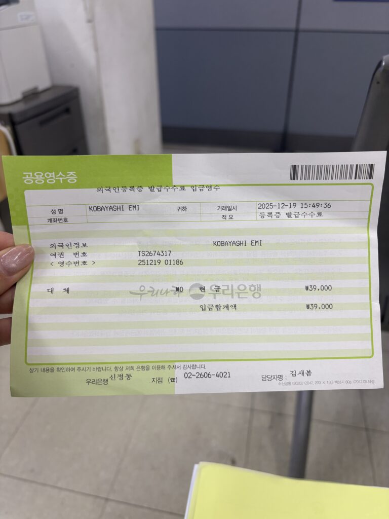 今回私はオモッキョ駅最寄りのソウル出入国事務所では、3階の対面窓口で39000₩を払って領収書をもらいました。